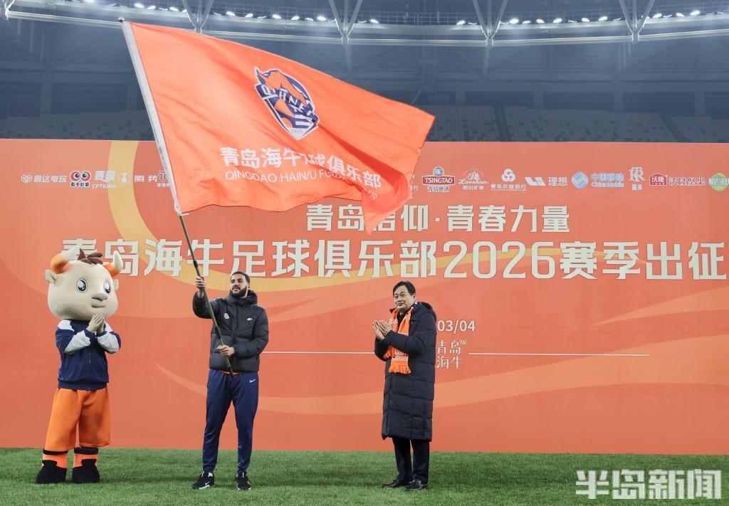 青岛市人民政府副市长赵胜村在出征仪式上为海牛队授旗出征,队长梅萨乌迪接过大旗并用力挥舞。这标志着海牛队2026赛季中超征程正式开启。根据赛程,海牛新赛季首场比赛将于本月7日奔赴昆明,客场挑战云南玉昆,首个主场比赛会于3月20日上演,对手是实力不俗的浙江队。